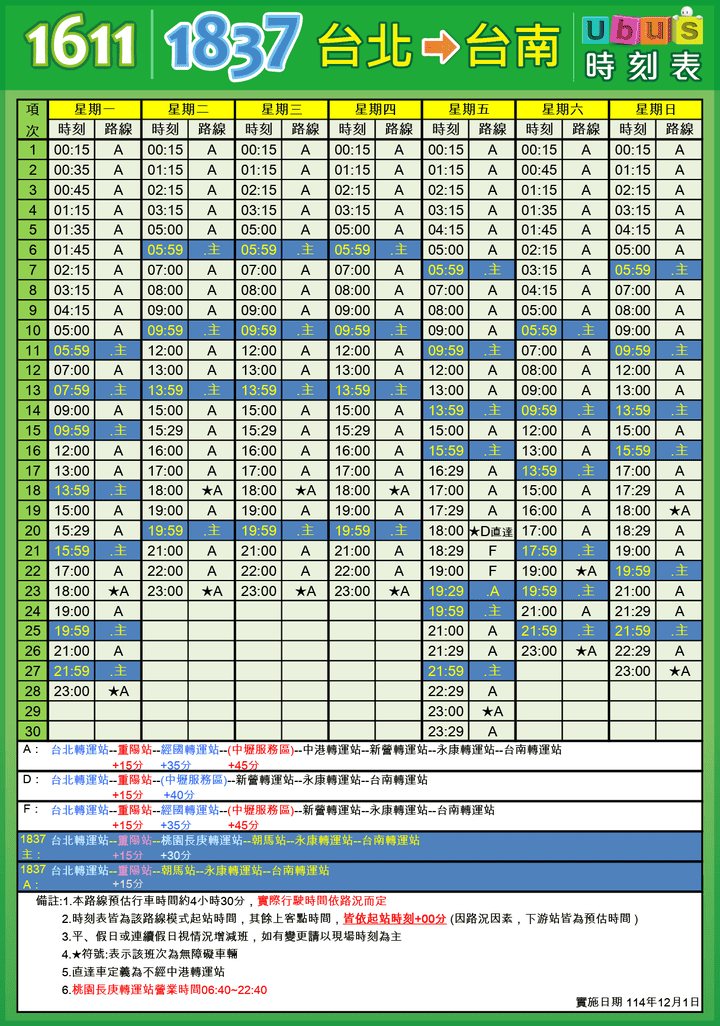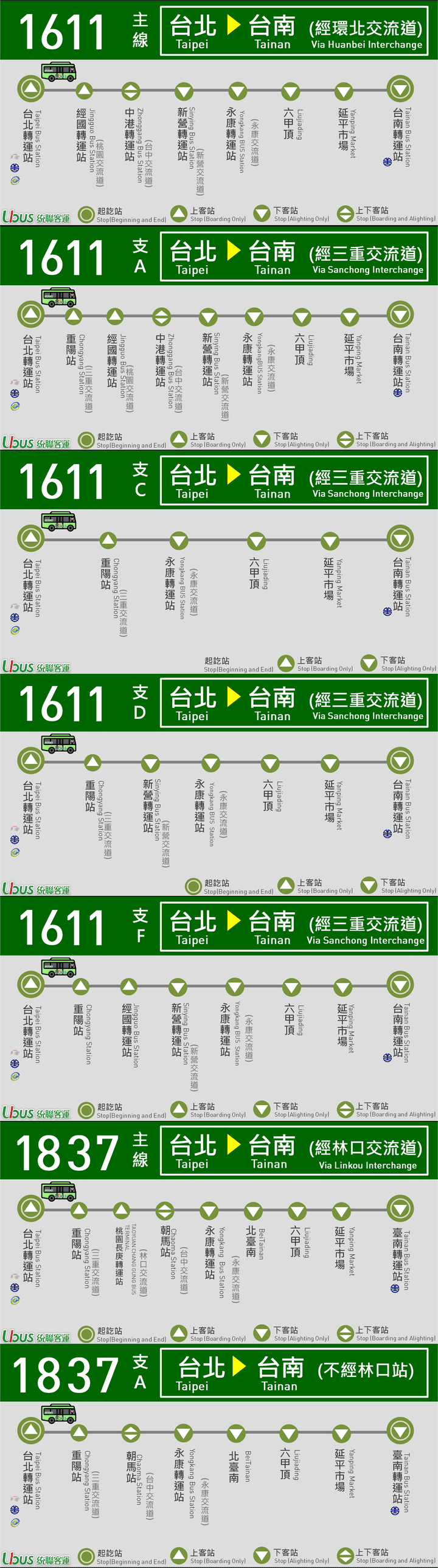 | 台北轉運站 → 重陽站 → 經國轉運站 → 中港轉運站(下客) → 新營轉運站(下客站) → 永康臨時轉運站(下客) → 六甲頂下客站 → 延平市場下客站 → 台南轉運站(下客站) |