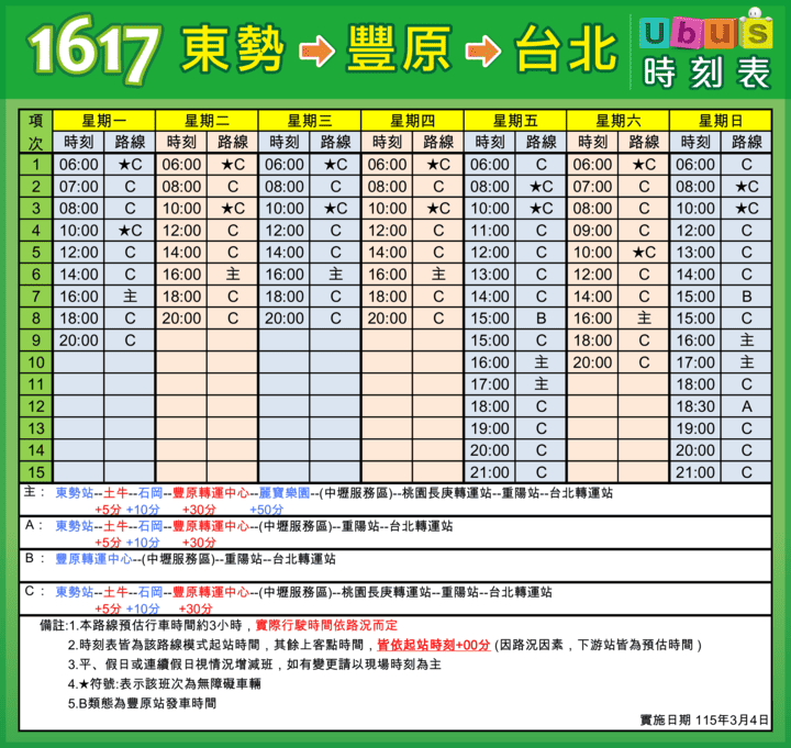 【1617】(B) 東勢→豐原→台北[豐原至臺北班次,不停麗寶樂園(月眉)站、林口站]