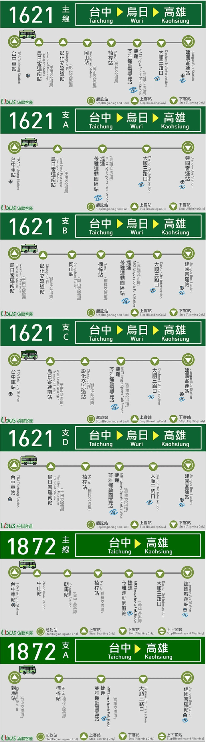 台中車站(大智北路) → 烏日客運南站 → 彰化交流道站 → 岡山下客站 → 楠梓下客站 → 捷運苓雅運動園區站 → 高雄大順三路口下客站 → 建國客運站(下客站) |