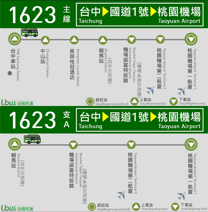 | 台中車站(大智北路) → 中山站 → 朝馬站 → 桃園機場第二航廈(下客) → 桃園機場第一航廈(下客) |