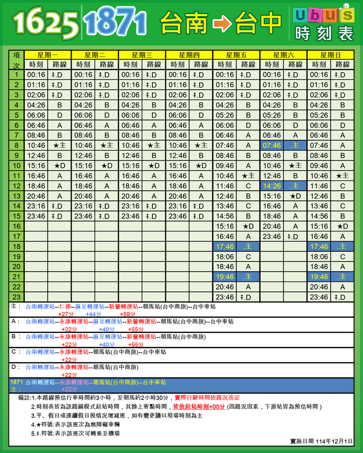 配合短端售票實施,本路線再增加販售:「台南-新營轉運站」、「台南-麻豆」等區間。另本路線配合國道轉乘市區公車優惠:持當日國道票根於台中(台中商旅、台中車站)轉乘統聯市區公車,可免費搭乘一次。