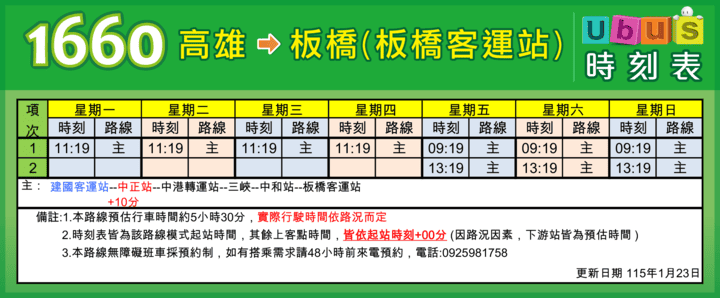搭乘「【1660】板橋-高雄」路線為配合兩段轉乘之規定,須於乘車前購買兩張段車票,造成不便敬請見諒。另本路線配合國道轉乘市區公車優惠:持當日國道票根於高雄(高雄車站)轉乘統聯市區公車,可免費搭乘一次。配合短端售票實施,本路線需購買:「板橋-中港轉運站」、「中港轉運站-高雄」區間車票。