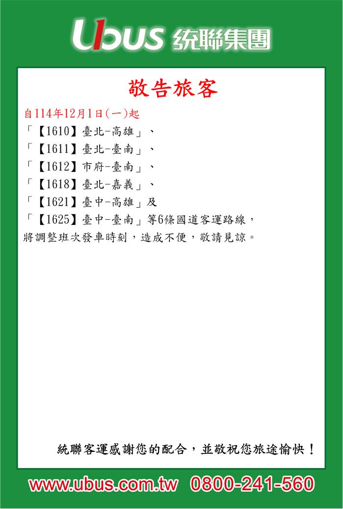 有關【1610】臺北-高雄、【1611】臺北-臺南、【1612】市府-臺南、【1618】臺北-嘉義、【1621】臺中-高雄及【1625】臺中-臺南,等6條調整班次。