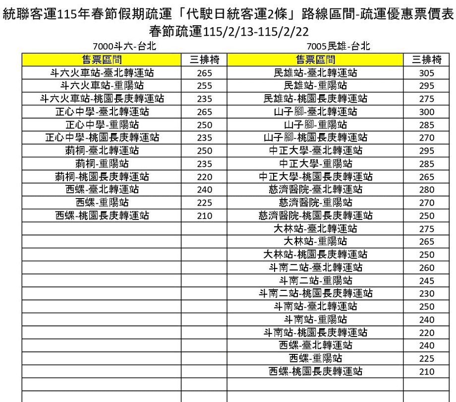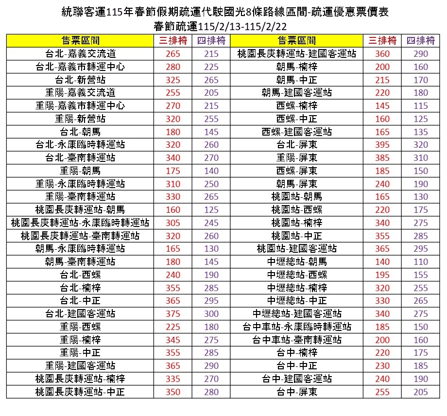 2.連假優惠適用路線及區間請詳見下方票價表。