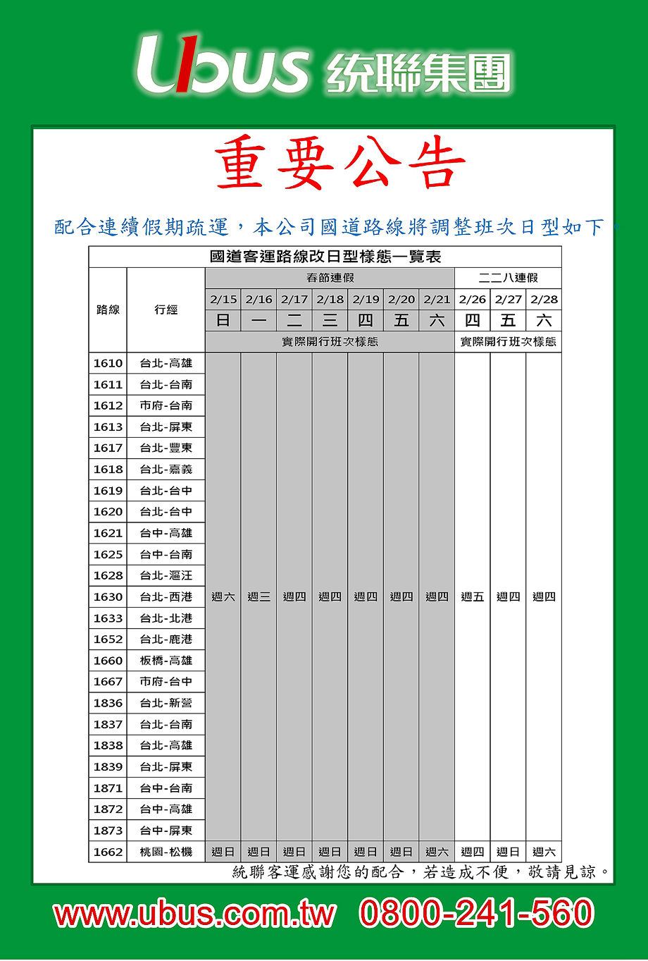 配合連假疏運,本公司【1610】臺北-高雄等24條路線 調整日型樣態一覽表。