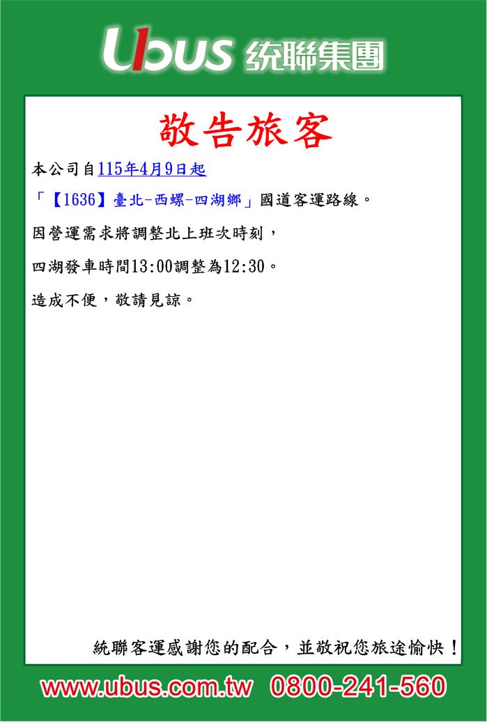 有關統聯客運【1636】臺北-西螺-四湖鄉路線,返程於115/4/9起調整時刻。