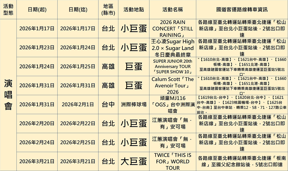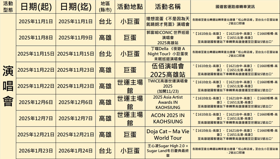 各地區活動(展覽、演唱會、路跑等)舉辦及轉乘資訊一覽表