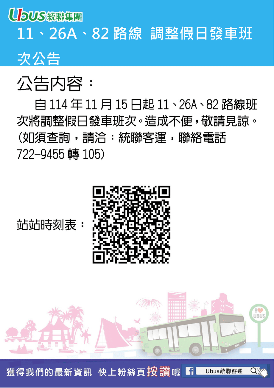 114年11月15日起 11、26A、82 調整假日發車班次公告