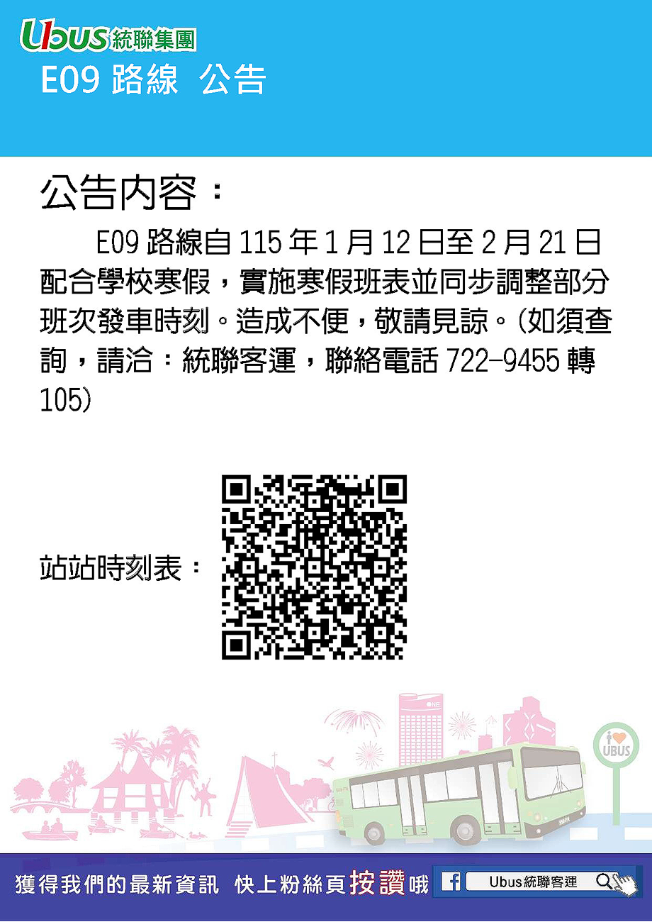 E09路線 115年1月12日起實施寒假班表暨調整發車時刻公告