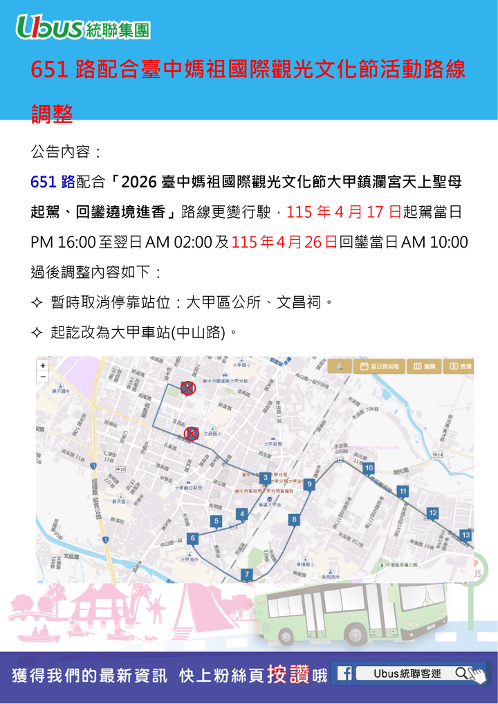 651路 配合臺中媽祖國際觀光文化節活動路線調整