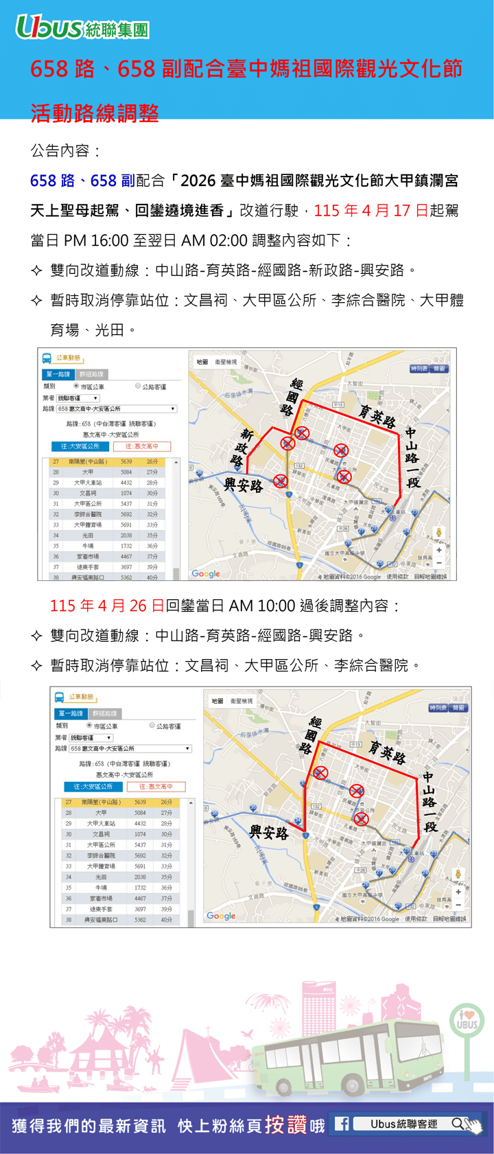 658路、658副 配合臺中媽祖國際觀光文化節活動路線調整