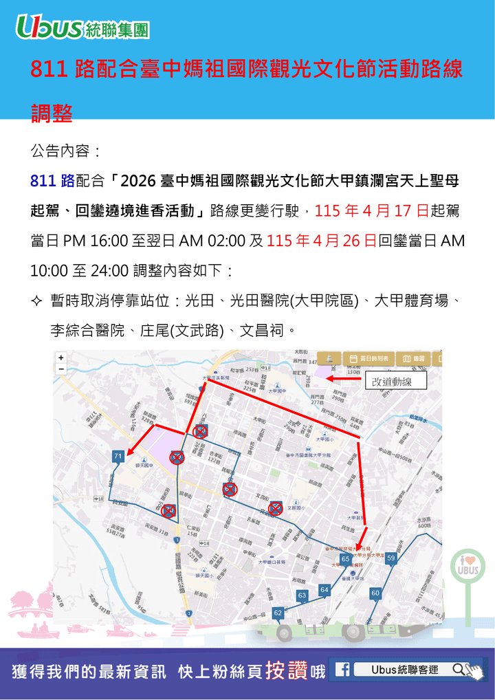 811路 配合臺中媽祖國際觀光文化節活動路線調整